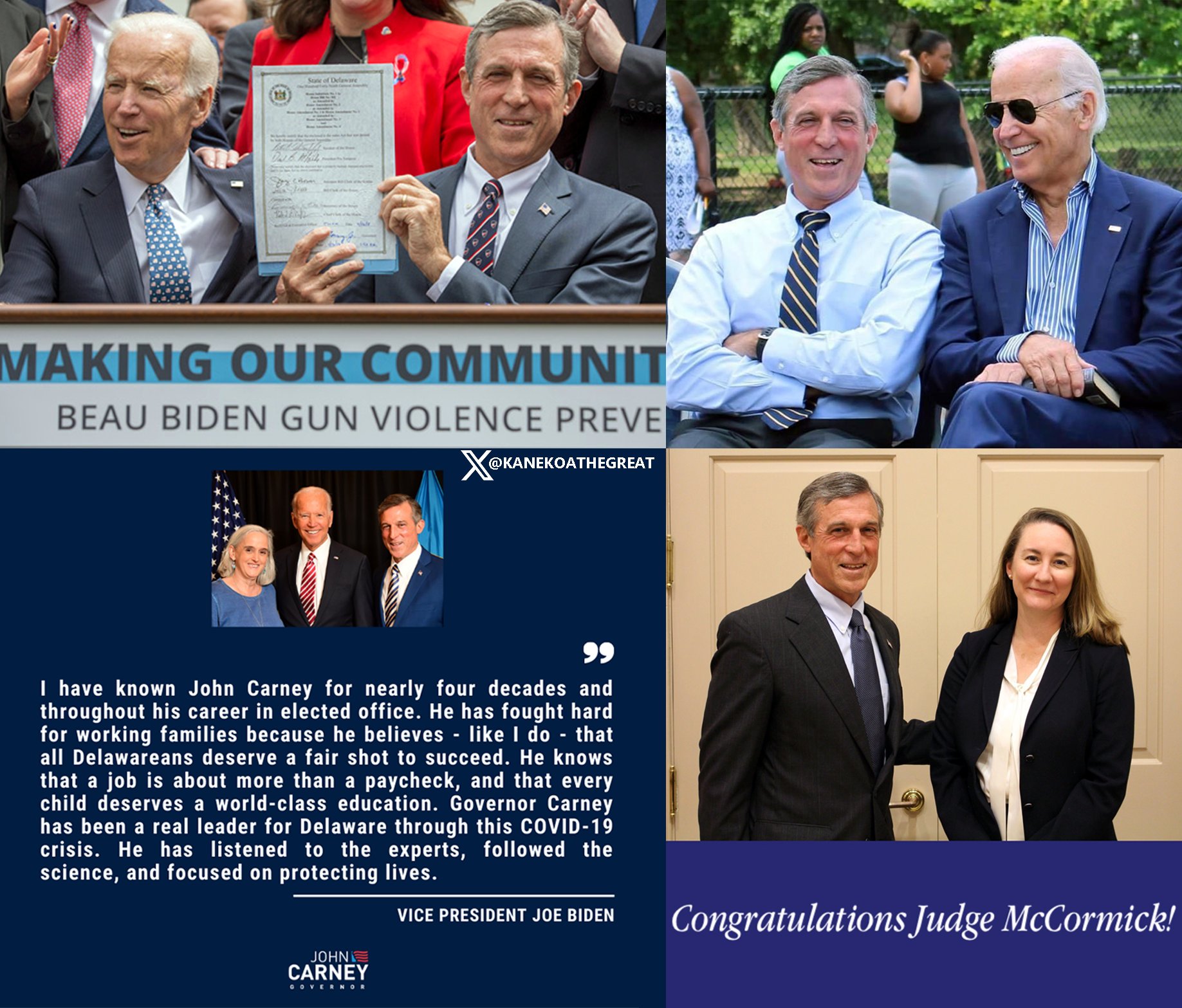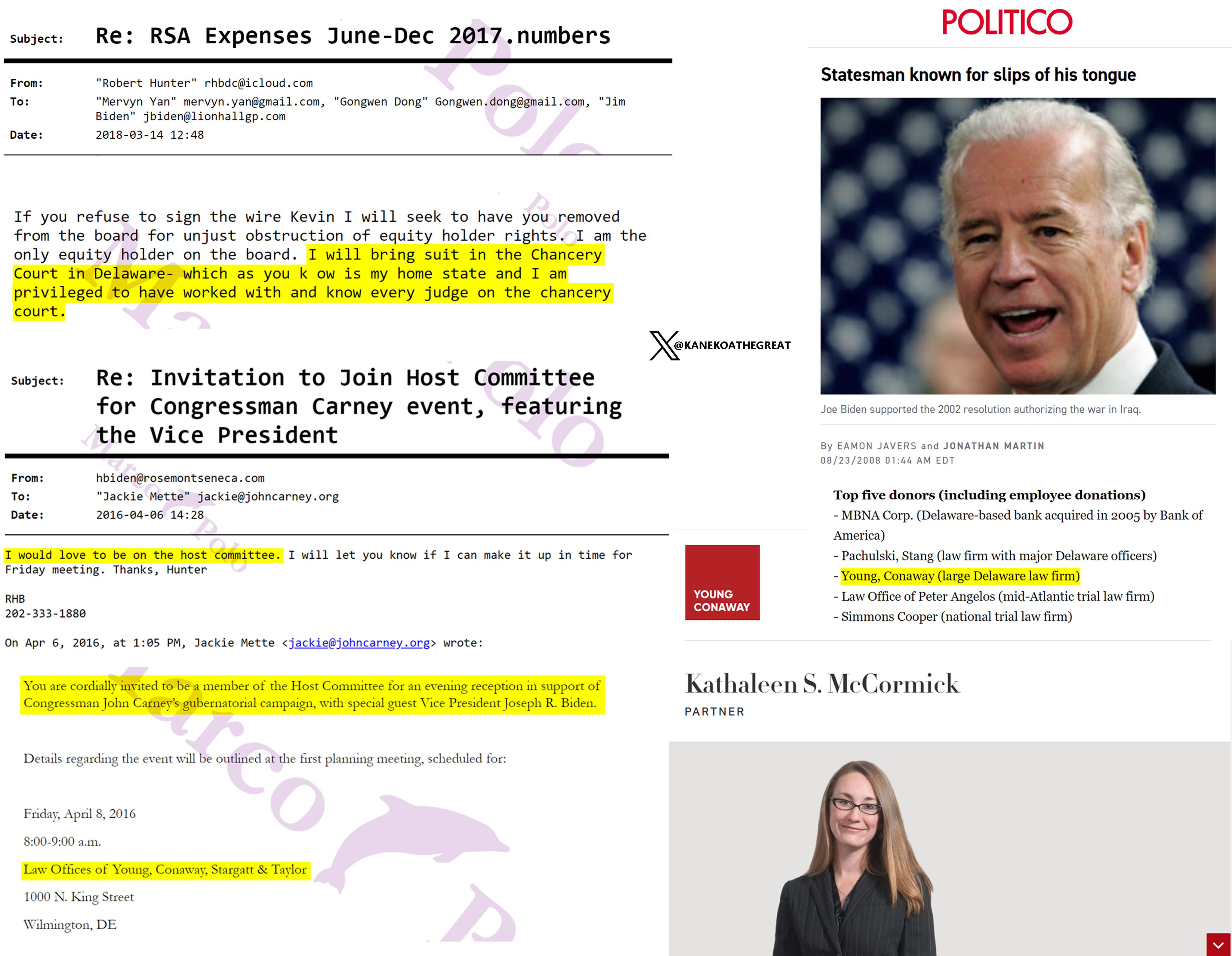 Judge Kathaleen McCormick rescinded Elon Musk’s $55 billion Tesla compensation package, overturning the company’s board and 80% of its shareholders. McCormick also ruled against @elonmusk during his Twitter acquisition. Before becoming the head of the Delaware Chancery Court, McCormick worked at a Delaware law firm called Young Conaway. This firm and its employees have been major donors to President Joe Biden for decades. In 2016, Hunter Biden hosted a gubernatorial campaign event for Congressman John Carney, with then-Vice President Joe Biden as the guest speaker. This event took place at the Law Offices of Young Conaway in Wilmington, Delaware. Carney, a close friend of Joe Biden for the last four decades, later became governor and nominated Kathaleen McCormick, a partner at Young Conaway, to her position on the Delaware Chancery Court. In a March 2018 email, Hunter Biden claimed to personally know every judge on the Delaware Chancery Court while threatening legal action against his Chinese business partners. “I will bring the suit in the Chancery court in Delaware – which as you know is my home state and I am privileged to have worked with and know every judge on the chancery court.” After Elon Musk purchased Twitter with the stated goal of restoring free-speech, President Biden called for a federal investigation into Musk on the podium at the White House. Following this, the Biden Department of Justice, Securities and Exchange Commission, and Federal Trade Commission initiated legal actions and investigations against Tesla, SpaceX, and X. This recent decision by Judge McCormick, who worked with Biden’s top donors and was nominated by Biden’s close friend, to override Tesla’s board and the majority of its shareholders is another clear example of the Biden administration and its allies weaponizing the American legal system against their political opponents.
